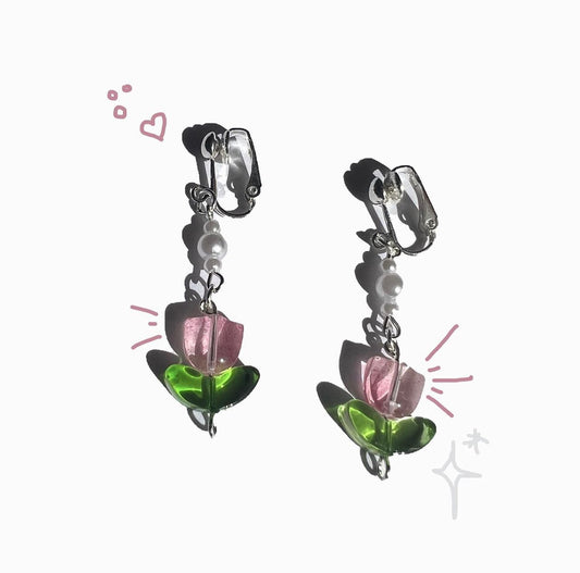 Pink Tulip Leaf 🍃 Earrings/Clip-on